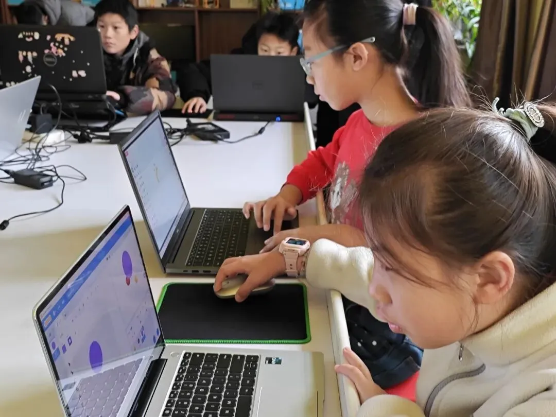 演示结束后,学员们迅速投入创作。他们紧盯电脑屏幕,手指在键盘与鼠标上灵活操作,时而凝神思索编程逻辑,时而小声交流调试技巧,整个教室只听见键盘敲击声和偶尔的讨论声,每个人的脸上都写满专注。遇到难题时,大家主动举手请教老师,或与同伴互相探讨,在互帮互助中攻克一个又一个关卡。