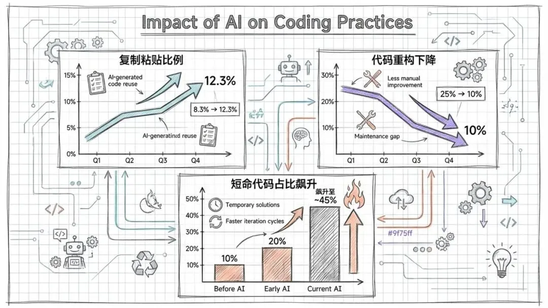 让我们用数据说话。软件开发分析公司GitClear追踪了数亿行代码的变更,其2024到2025年的报告撕碎了我们盲目乐观的滤镜。随着GitHub Copilot和Cursor等AI辅助编程工具的普及,代码的生产方式确实发生了变化,但这并非全是好消息。