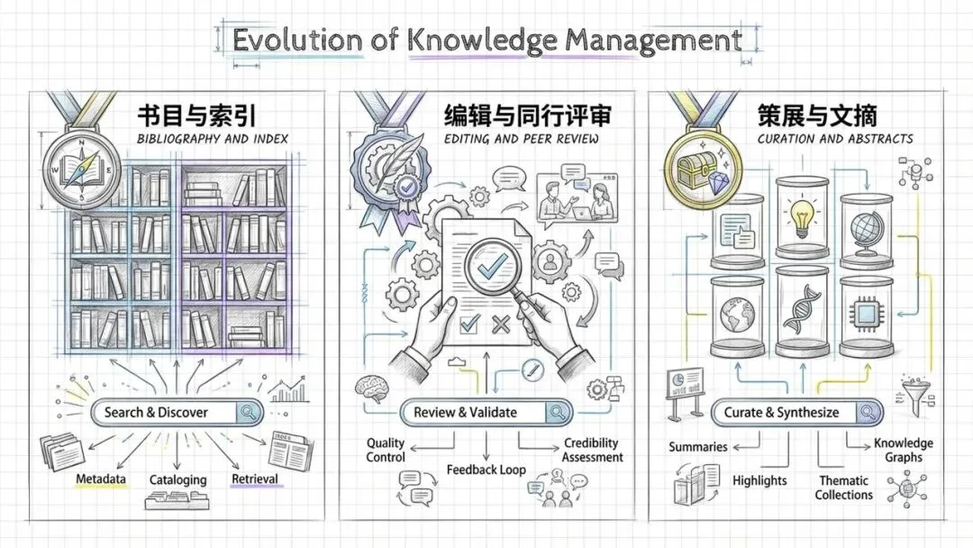 “质量稀释”:手抄本时代,每本书都是抄写员精心校对筛选的。印刷术普及后,粗制滥造、错漏百出的文本涌入市场,导致知识整体质量下降。“注意力碎片化”:学者们抱怨海量低质量内容分散了他们对经典著作的注意力,引发“认知枯竭”。康德和华兹华斯等思想家都曾描述过这种信息过剩带来的精神疲惫。然而,历史的结局并非文明崩溃,而是知识管理体系的进化!为应对书籍洪流,人类被迫发明了一系列工具和制度,构成了现代学术和科学大厦的基石: