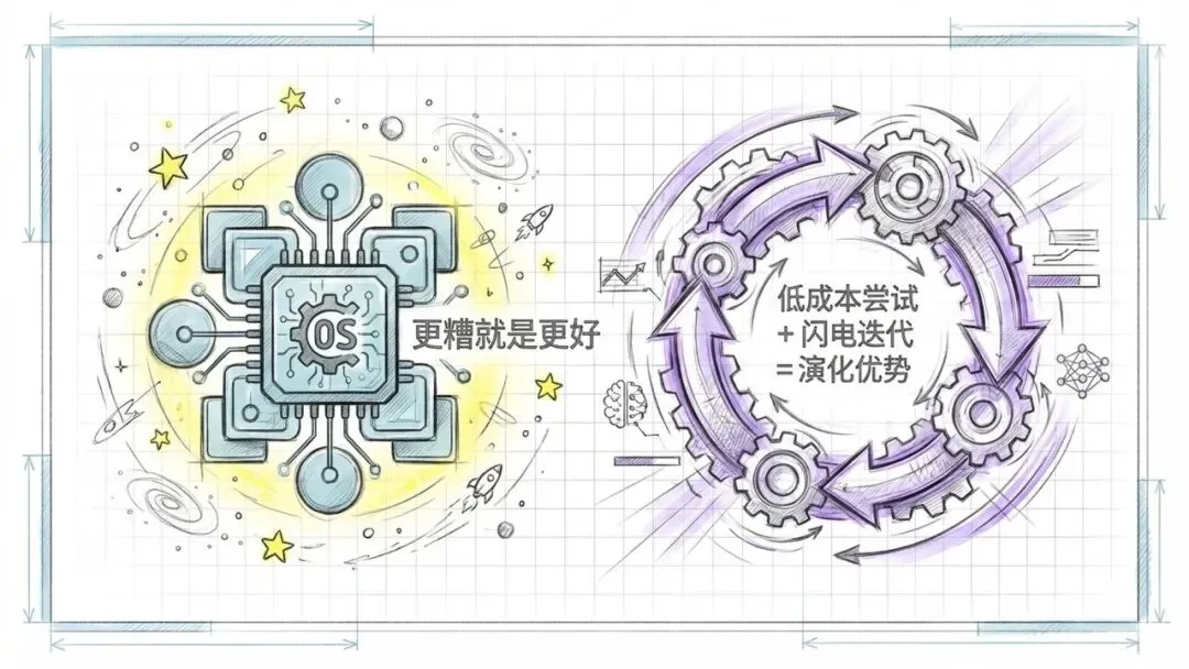 如今AI生成的代码,正是“更糟就是更好”哲学的极致体现。AI生成的代码可能不完美,可能冗余,甚至含有Bug,但它拥有两个压倒性优势:极低的成本和极快的迭代速度。这种特性允许开发者在单位时间内进行无数次尝试。纳瓦尔说得对,判断力是经验的复利。如果AI能让我们以极低成本进行上万次“试错”,那么即使单次产出质量不高,最终演化出的系统也可能通过快速迭代,战胜那些精雕细琢但演化缓慢的传统软件。