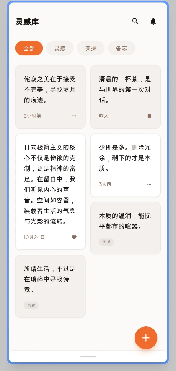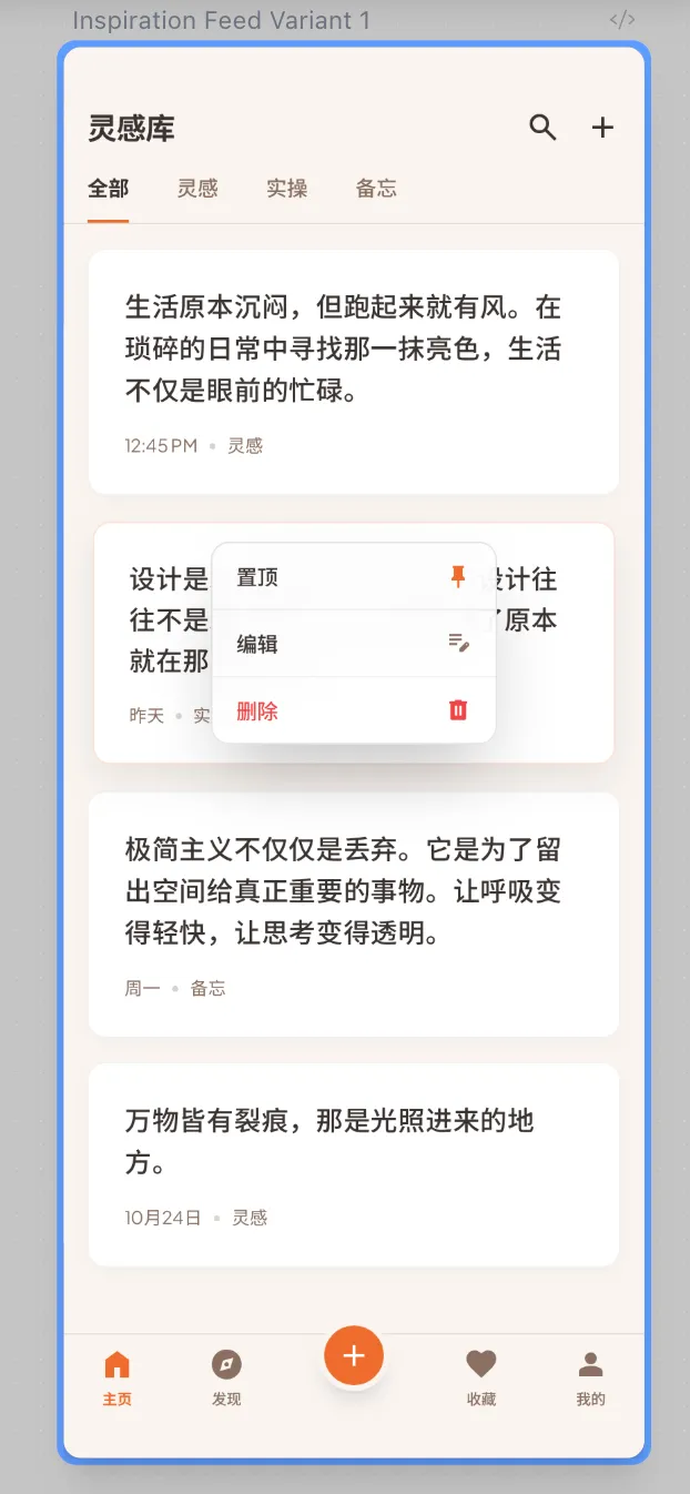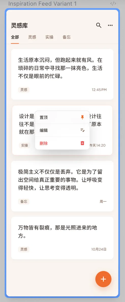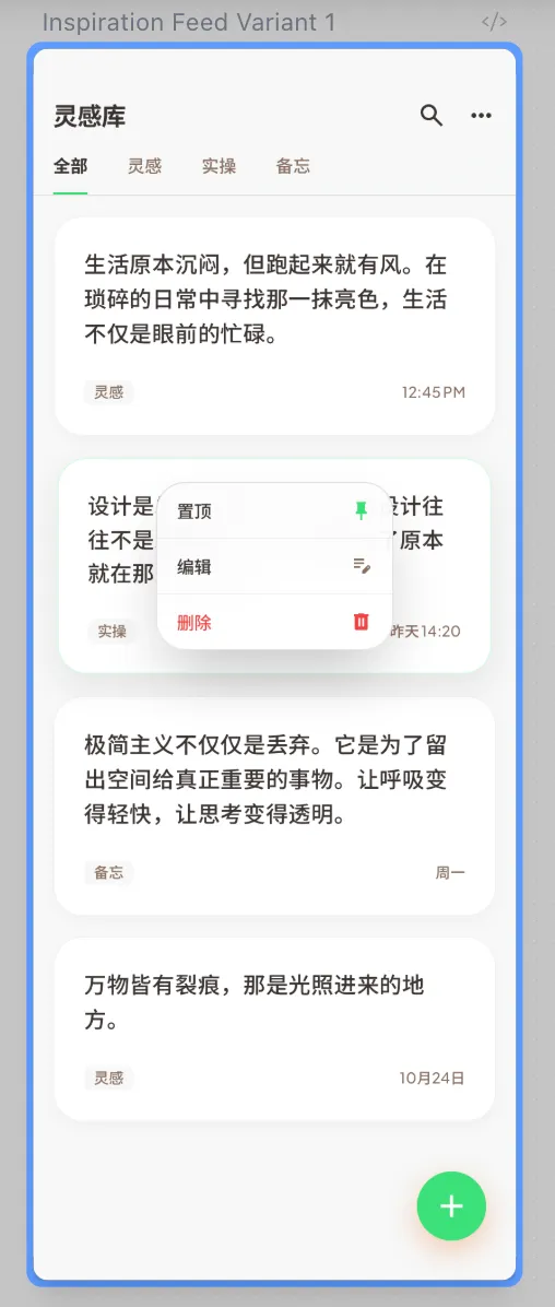Chinese Inspiration Card Feed: This screen features a clean, single-column feed with a "Fresh Japandi" aesthetic. It includes a sticky top navigation with Chinese labels (全部, 灵感, 实操, 备忘), and soft rounded cards on a warm cream background. Crucially, Cards contain only text nodes (no markup, no images, no rich text), high-legibility CJK typography, and a long-press context menu for card management.