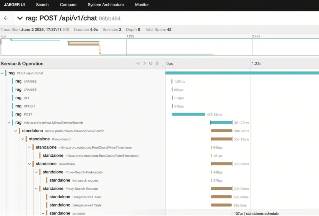 链路追踪:本项目使用OpenTelemetry JavaAgent,覆盖Chat → Milvus → 模型调用的全链路调用追踪(grpc调用链关键)
