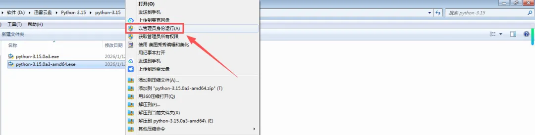 1.解压安装包,选中“Python-3.15.0a3-amd64.exe”右击选择“以管理员身份运行”。