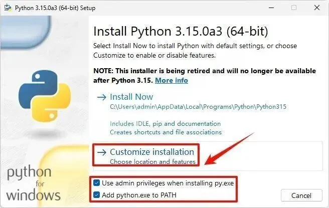 2.勾选“Use admin....”和“Add Python...”,点击“Customize installation”。