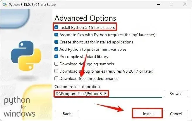 4.勾选“Install Python 3.15...”,选择软件安装路径,点击“Install”。