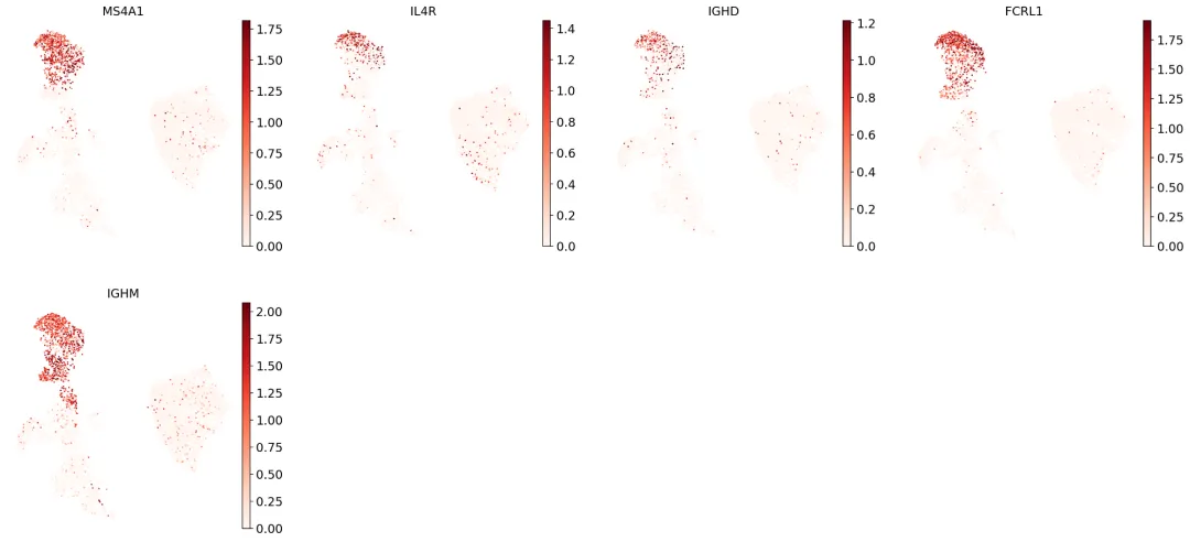 上面共画了5个B细胞亚群,这里放其中一组。从上面(还没有做聚类)可以看出: