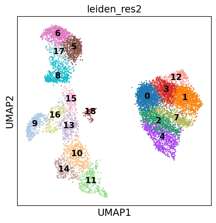 # 测试多个分辨率并保存结果resolutions = [1,2]for i, res in enumerate(resolutions): sc.tl.leiden(adata, resolution=res, key_added=f"leiden_res{res}")sc.pl.umap(adata, color="leiden_res2", legend_loc='on data',legend_fontsize=12) # 在数据点上显示