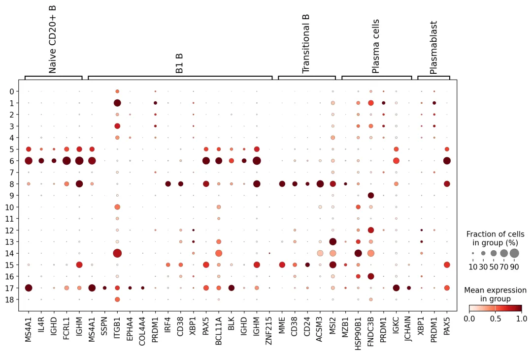 B_plasma_markers = { ct: [m for m in ct_markers if m in adata.var.index]for ct, ct_markers in marker_genes.items()if ct in B_plasma_cts}sc.pl.dotplot( adata, groupby="leiden_res2", var_names=B_plasma_markers, standard_scale="var", # standard scale: normalize each gene to range from 0 to 1)