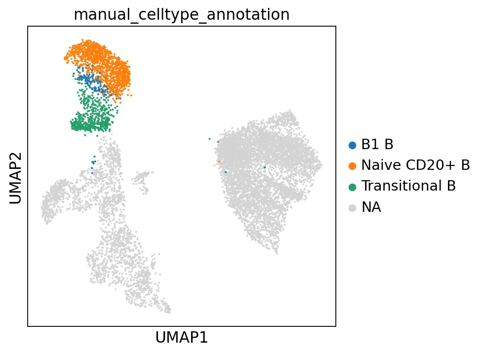 cl_annotation = {"5": "Naive CD20+ B","6": "Naive CD20+ B","8": "Transitional B","17": "B1 B", # note that IGHD and IGHM are negative markers, in this case more lowly expressed than in the other B cell clusters}adata.obs["manual_celltype_annotation"] = adata.obs.leiden_res2.map(cl_annotation)sc.pl.umap(adata, color=["manual_celltype_annotation"])
