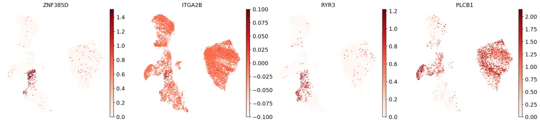 sc.pl.umap( adata, color=[ "ZNF385D","ITGA2B","RYR3","PLCB1",], vmax="p99", legend_loc="on data", frameon=False, cmap="Reds",)