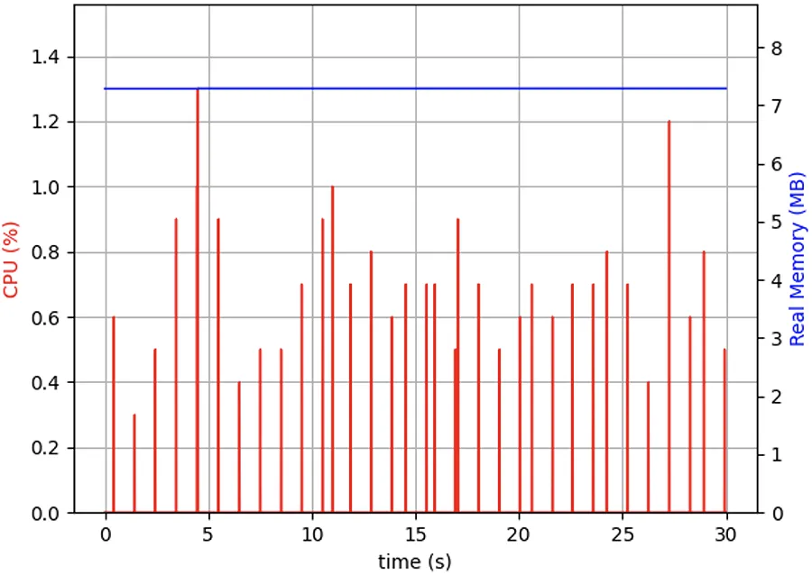 图 3.4 使用 selectors 的回显服务器的 CPU 图。此方法的利用率始终在 0% 到 1% 之间浮动。