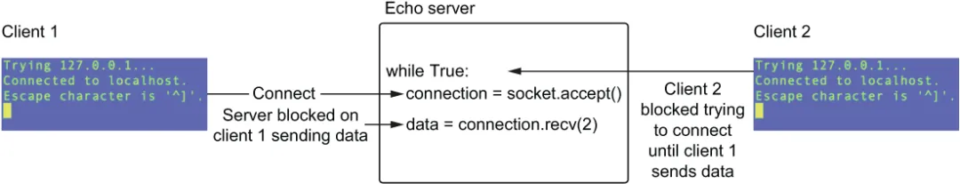 我们可以尝试这样操作:先用 telnet 建立一个连接并输入一条消息。然后,再用第二个 telnet 客户端连接并发送另一条消息。然而,如果你这么做了,会立刻发现问题。第一个客户端工作正常,能像预期那样回显消息,但第二个客户端却收不到任何回显。这是因为套接字的默认阻塞行为造成的。accept 和 recv 方法会一直阻塞,直到收到数据。这意味着,一旦第一个客户端连接,我们就会阻塞等待它发送第一条回显消息。这就导致其他客户端被卡住,必须等到第一个客户端发送数据后,循环才会继续(见图 3.2)。