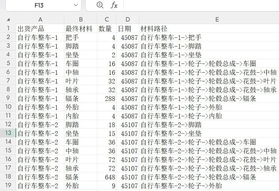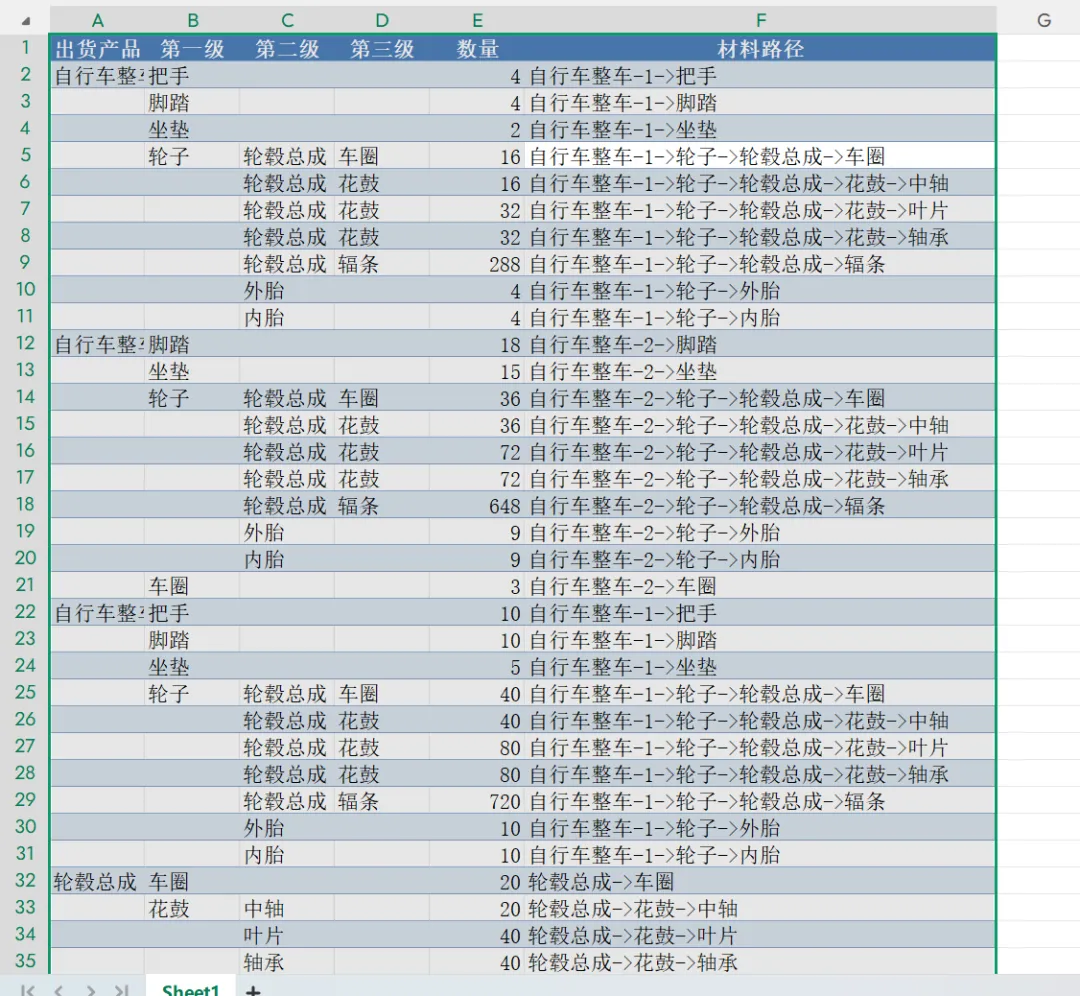 我们有一份自行车物料清单Excel,核心字段包括:出货产品、最终材料、数量、材料路径。其中“材料路径”是多层级拼接的字符串,比如: