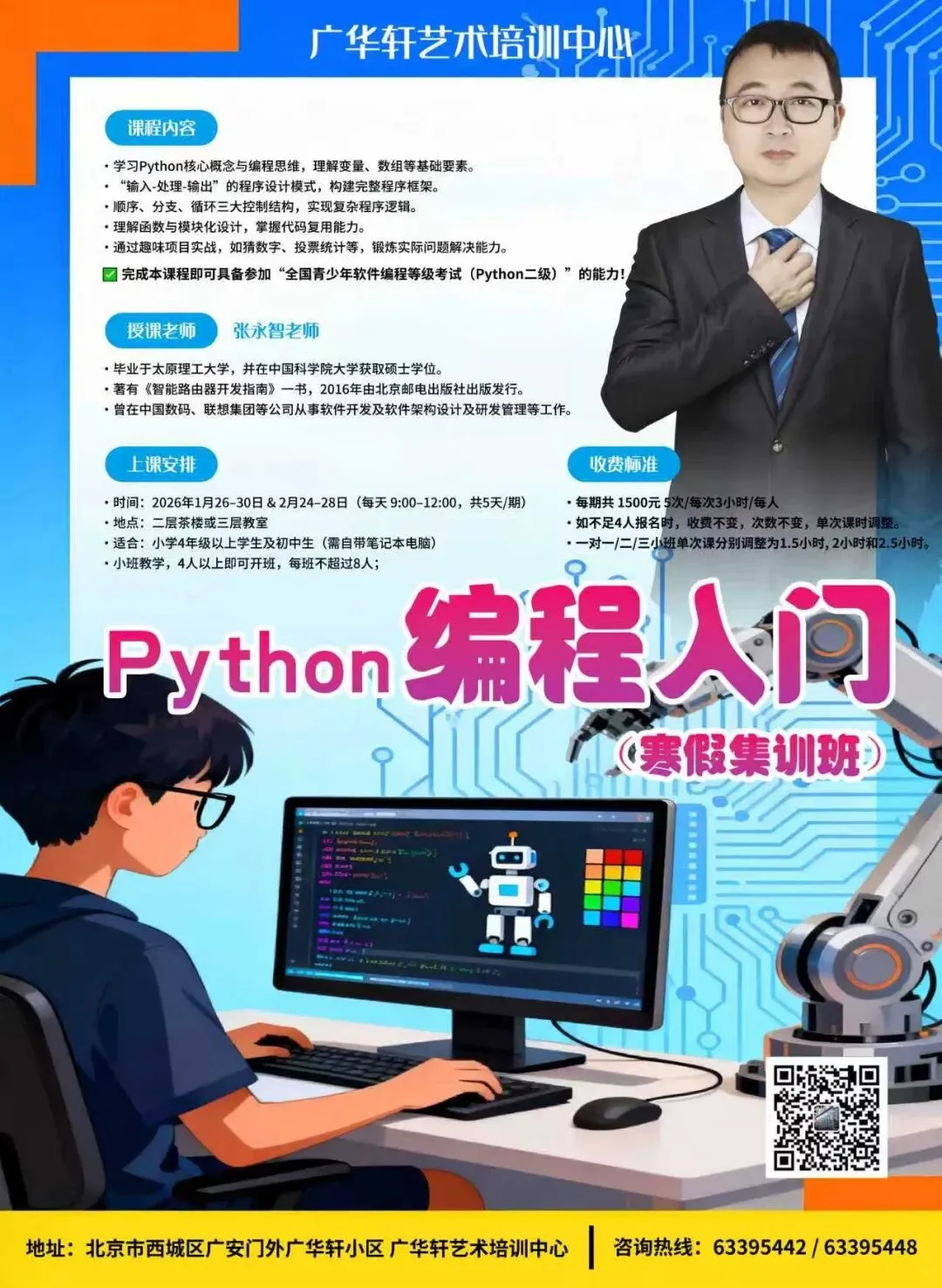 🎒 上课须知- 地点:北京市西城区广安门外广华轩小区 广华轩艺术培训中心- 自带笔记本电脑- 费用:仅1500元/期(共15小时,性价比超高!)- 不足4人?课时灵活调整,教学质量不打折!