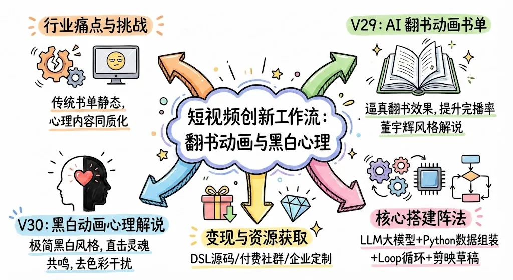 这套工作流(V29 & V30)结合了 AI 书评生成与黑白动画视觉策划,为了方便大家直接上手,我提供了完整的 DSL 源码。