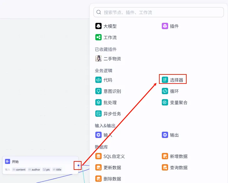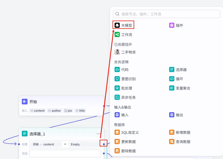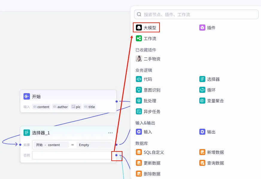 操作步骤:点击工作流画布上的 + 号,选择 大模型,并连接到 开始 节点。