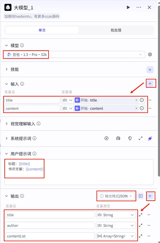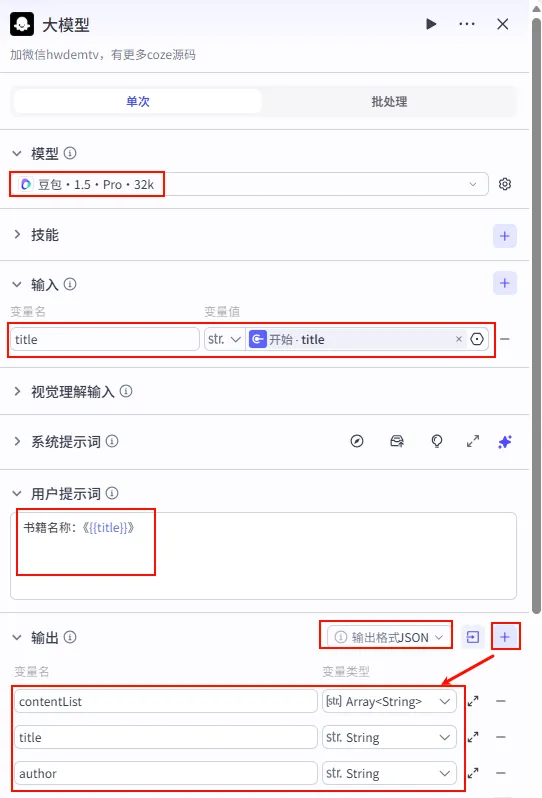 JSON。contentList: Array<String> (生成的文案数组)。title: String (书籍标题)。author: String (作者)。title: 引用 开始 - title。大模型生成文案。豆包·1.5·Pro·32k (长文本能力强/角色扮演逼真)。书籍名称:《{{title}}》。