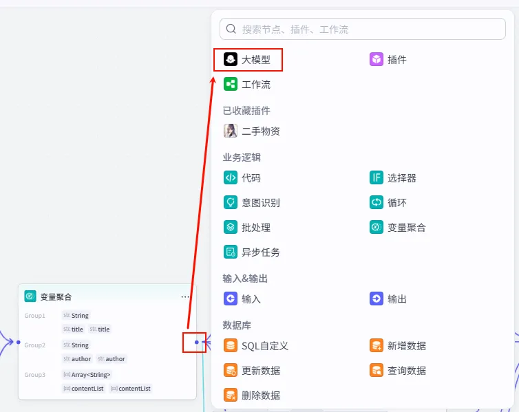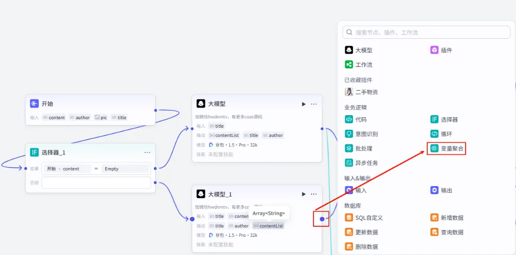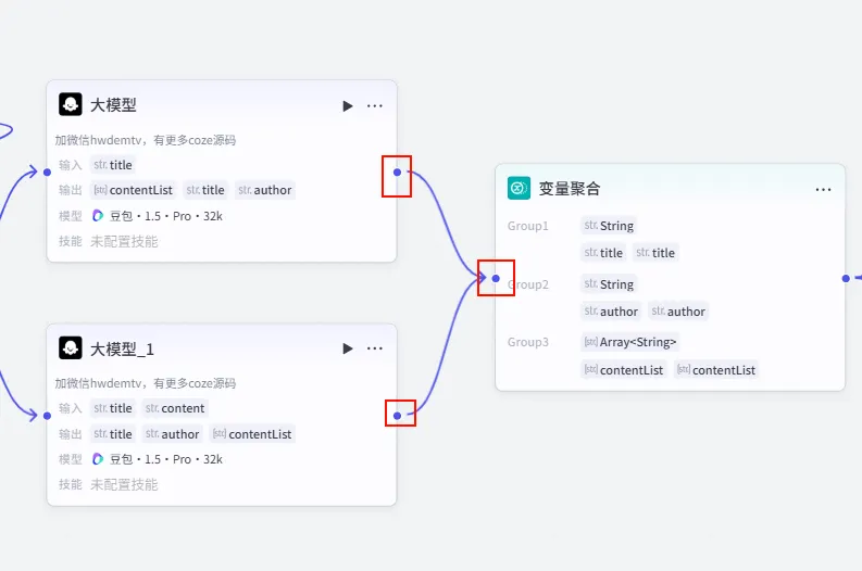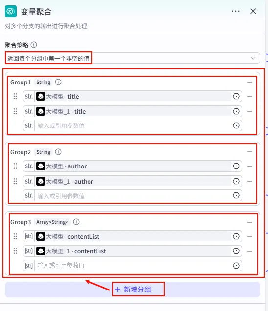 Group1 (String) -> 引用 大模型.title 和 大模型_1.title => 统一为 title。Group2 (String) -> 引用 大模型.author 和 大模型_1.author => 统一为 author。Group3 (Array<String>) -> 引用 大模型.contentList 和 大模型_1.contentList => 统一为 contentList。变量聚合。返回每个分组中第一个非空的值 (关键!)。