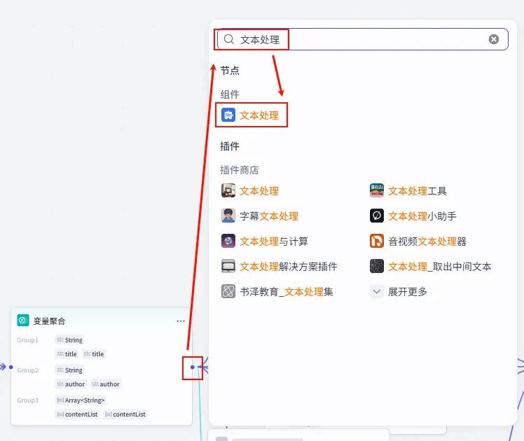操作步骤:点击 变量聚合 节点后的 + 号,搜索并添加 文本处理。