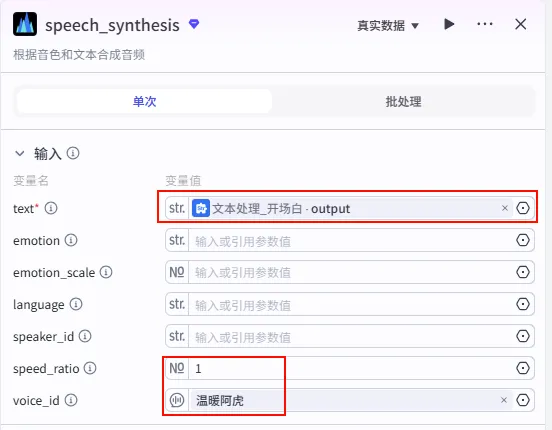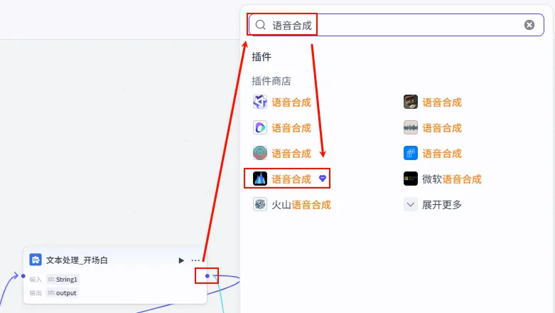 文本处理_开场白 节点后的 + 号,搜索并添加 语音合成。文本处理_开场白 的 output。温暖阿虎 (根据喜好选择,推荐温暖治愈系)。1 (默认)。