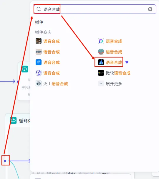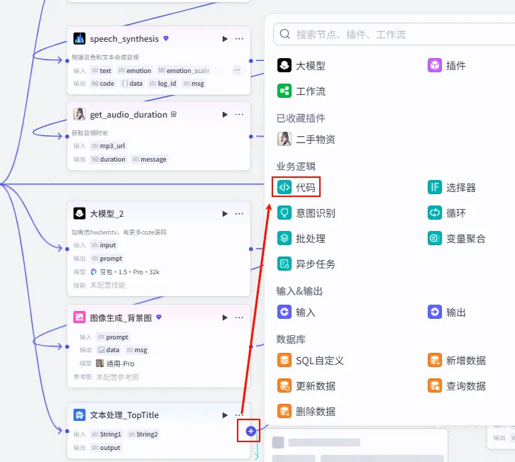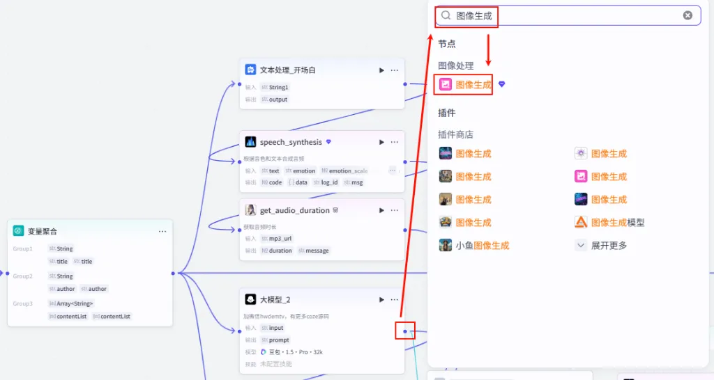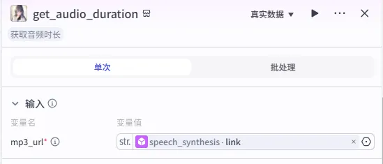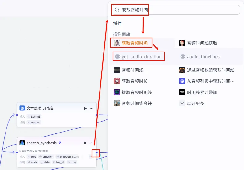 语音合成 节点后的 + 号,搜索并添加 获取音频时间。speech_synthesis 的 link (注意:部分插件可能输出 data,请根据实际情况选择音频链接字段)。