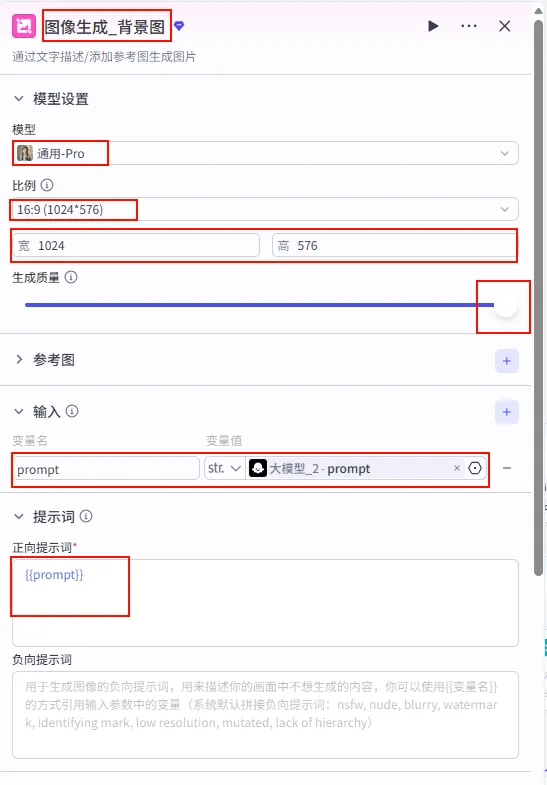 大模型_视觉转化 节点后的 + 号,搜索并添加 图像生成。图像生成_背景图。通用-Pro (画质较好)。16:9 (1024*576) (适配横屏视频)。大模型 的 prompt。