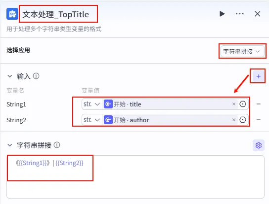 String1 引用 title。String2 引用 author。文本处理_TopTitle。字符串拼接。《{{String1}}》 | {{String2}} (书名 | 作者)。