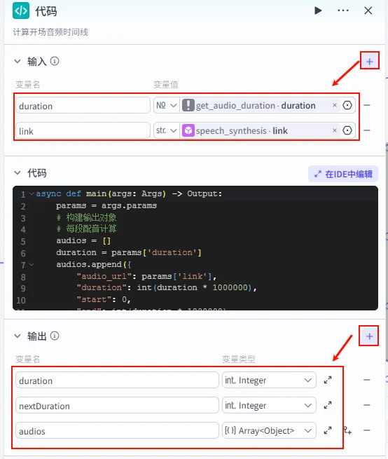 为了将上述三个分支的产物(开场音频、背景图、标题)整合,我们需要一个代码节点来计算开场音频的时间轴,并为后续的草稿合成做准备。