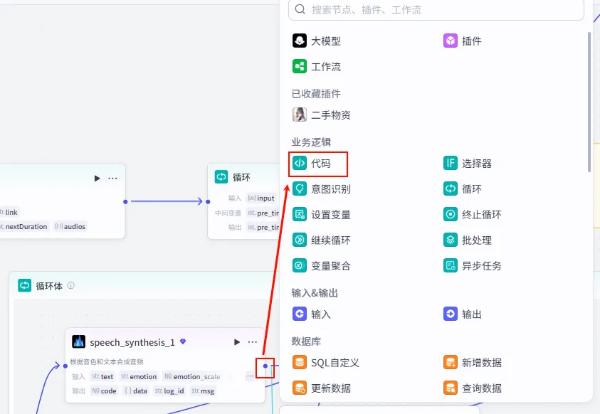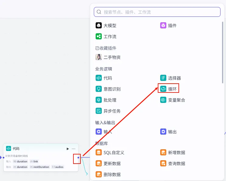 操作步骤:点击 代码 节点后的 + 号,选择 循环。