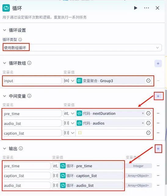 pre_time (int): 引用 代码.nextDuration (初始时间)。audio_list (Array): 引用 代码.audios (初始音频列表)。caption_list (Array): 手动输入 [] (初始为空列表)。使用数组循环。变量聚合.Group3 (即书评文案列表)。
