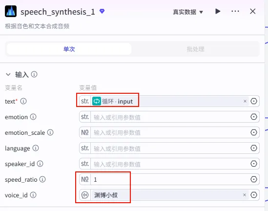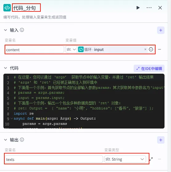 语音合成 节点后的 + 号,选择 代码。代码_分句。content 引用 循环 - item。texts (String)。