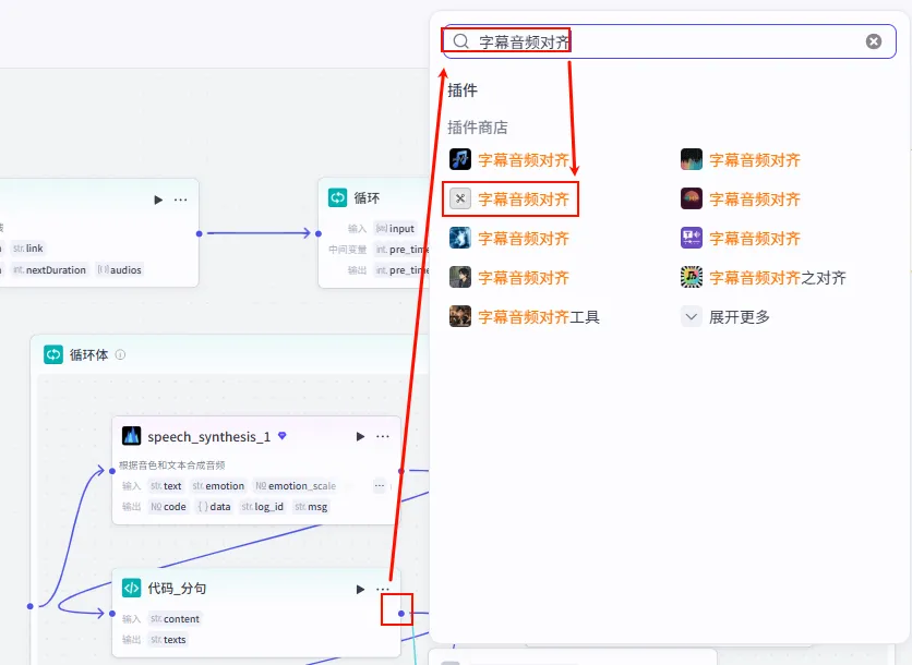 代码_分句 节点后的 + 号,搜索并添加 字幕音频对齐。speech_synthesis_1.link。代码_分句.texts。