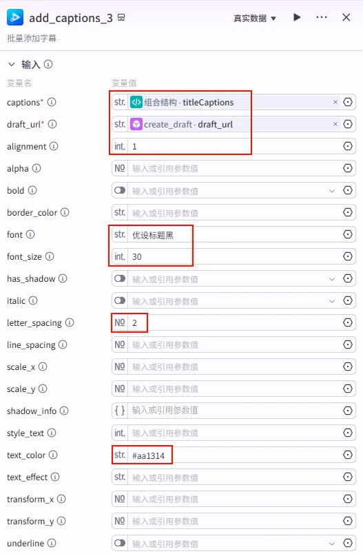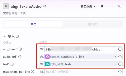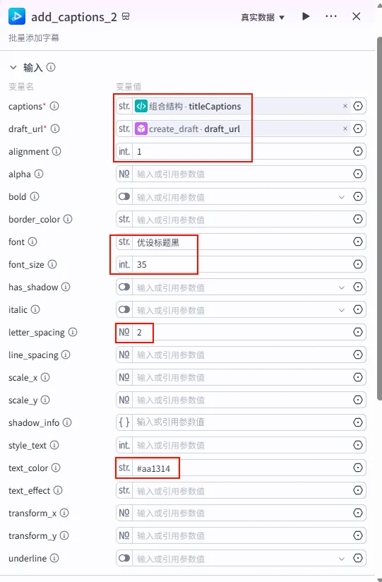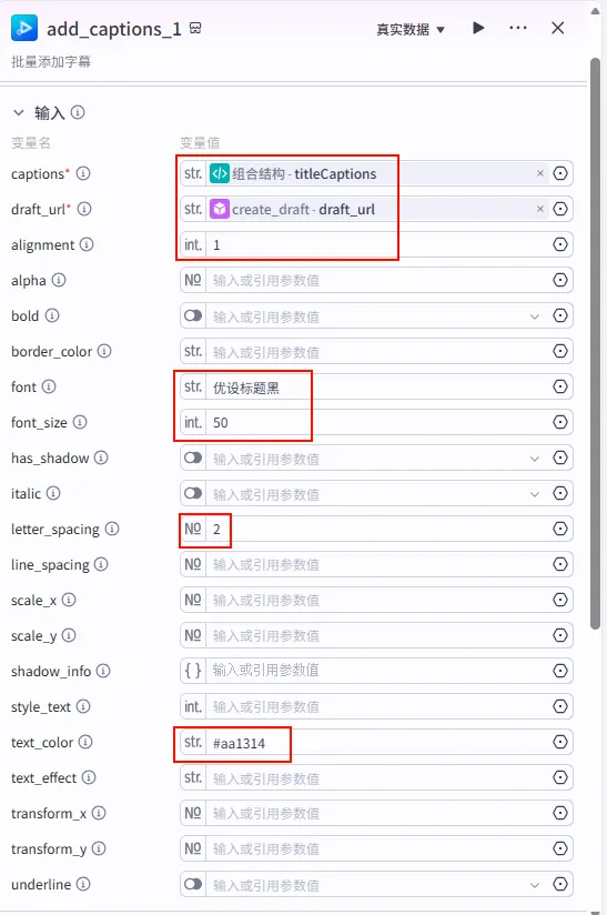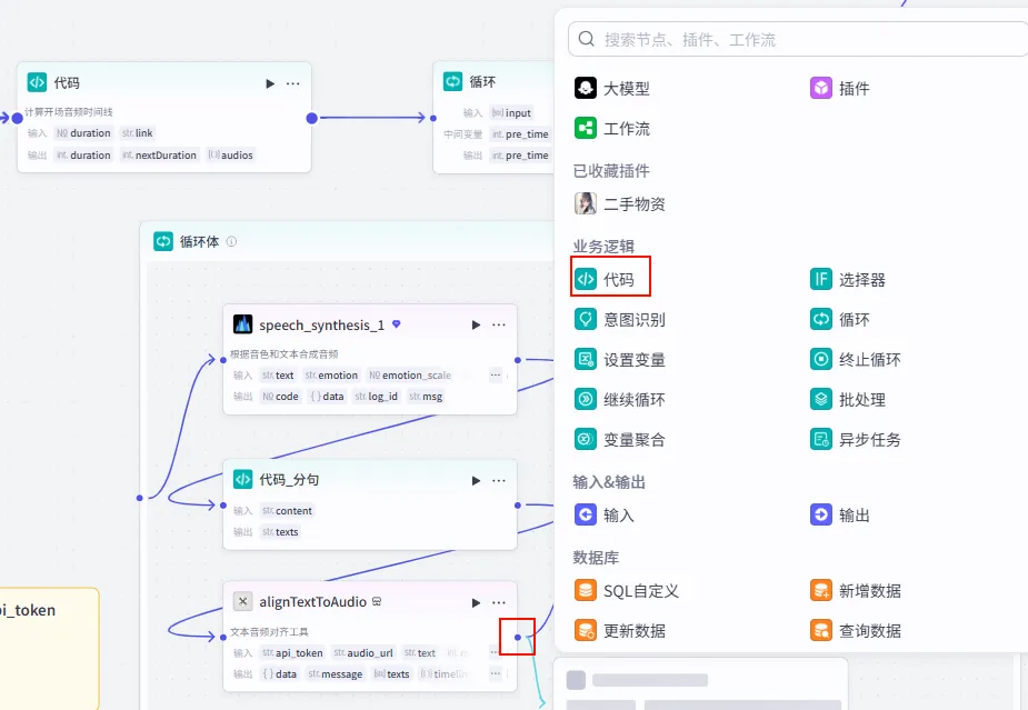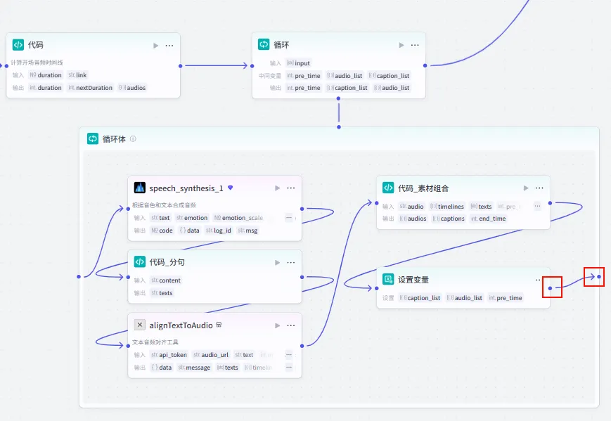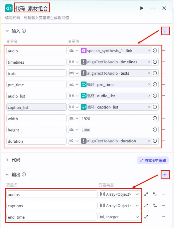 字幕音频对齐 节点后的 + 号,选择 代码。audios (Array<Object>)。captions (Array<Object>)。end_time (Integer)。audio (str): 引用 speech_synthesis_1.link。timelines (Array): 引用 alignTextToAudio.timelines。texts (Array): 引用 alignTextToAudio.texts。pre_time (int): 引用 循环.pre_time (累计时间)。audio_list (Array): 引用 循环.audio_list (累计音频)。caption_list (Array): 引用 循环.caption_list (累计字幕)。width: 固定值 1920。1080。duration: 引用 alignTextToAudio.duration。代码_素材组合。