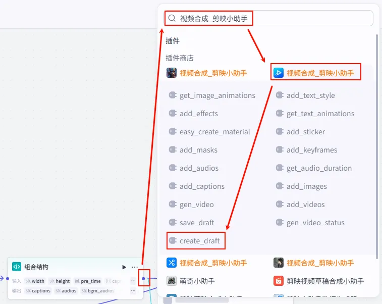 组合结构 节点后的 + 号,搜索并添加 视频合成_剪映小助手 插件中的 create_draft 工具。width: 1920height: 1080user_id: 572017draft_url (草稿链接) 和 tip_url。
