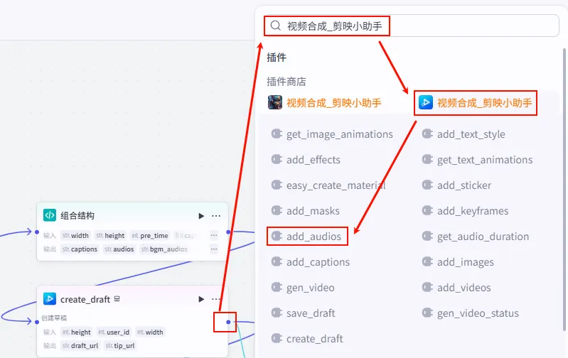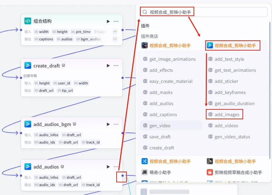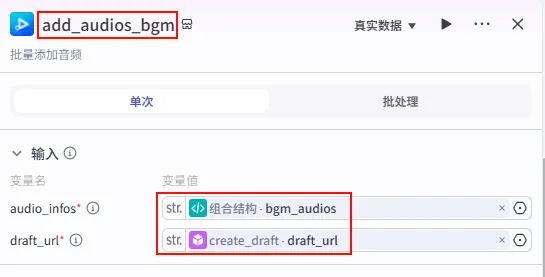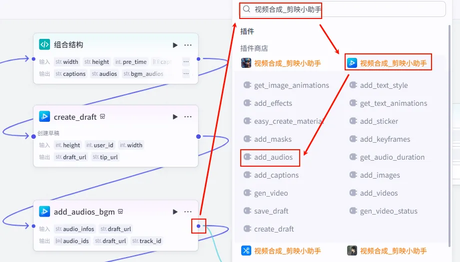 create_draft 节点后的 + 号,搜索并添加 add_audios 工具。add_audios_bgm (建议重命名以便区分)。audio_infos: 引用 组合结构.bgm_audios (注意:这里引用的是 BGM 轨道数据)。draft_url: 引用 create_draft.draft_url (串联上一步)。draft_url 给下一步。