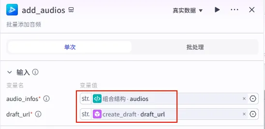 add_audios_bgm 节点后的 + 号,再次添加 批量添加音频 工具。add_audios (默认) 或 add_audios_voice。组合结构.audios (这是人声配音轨道)。create_draft.draft_url (或上一个节点的输出)。