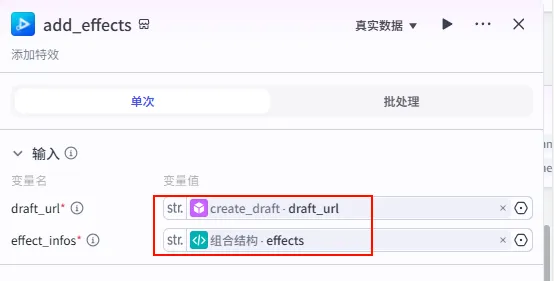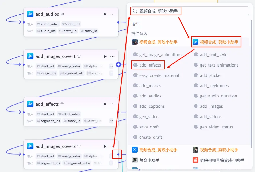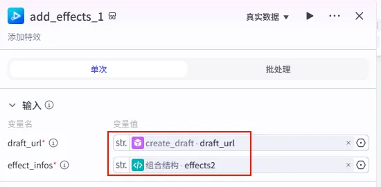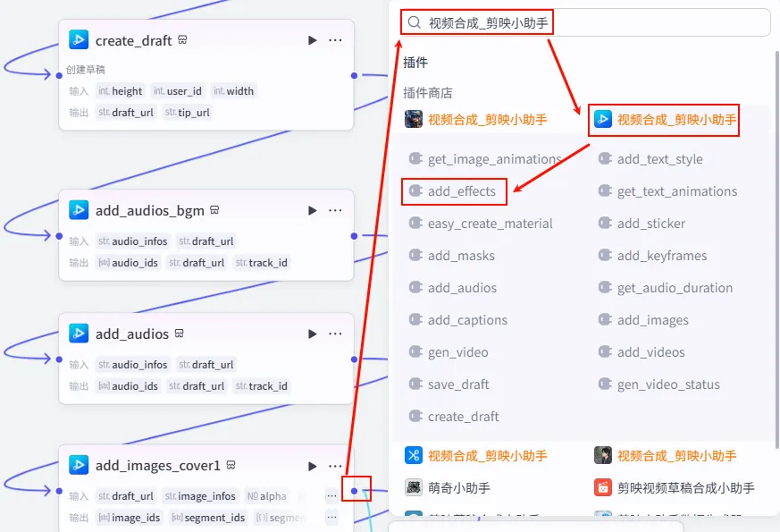 add_images_cover2 节点后的 + 号,再次添加 批量添加特效 工具。add_effects_1。create_draft.draft_url。组合结构.effects2 (注意这里引用的是第二个特效列表)。