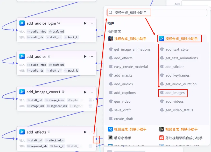 add_effects 节点后的 + 号,再次添加 批量添加图片 工具。add_images_cover2 (或 add_images_bg)。组合结构.imgs2 (对应背景图)。create_draft.draft_url。