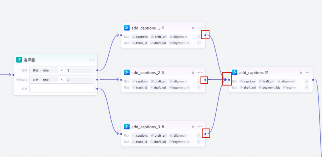所有分支设置完标题后,需要汇聚到一个共同的节点( add_captions 节点)来继续添加正文字幕和顶部常驻标题。