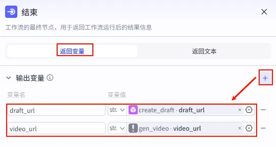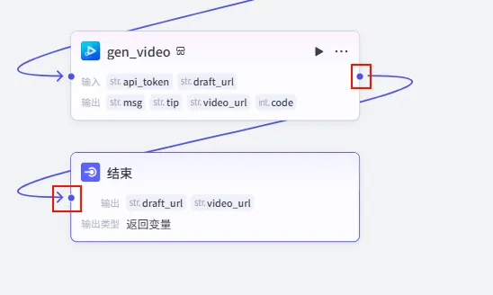 gen_video 的输出点,连接到 结束 节点。返回变量。create_draft.draft_url (草稿链接)。gen_video.video_url (成片链接)。