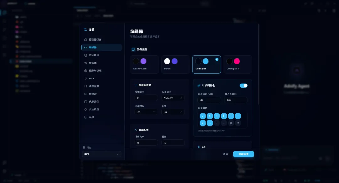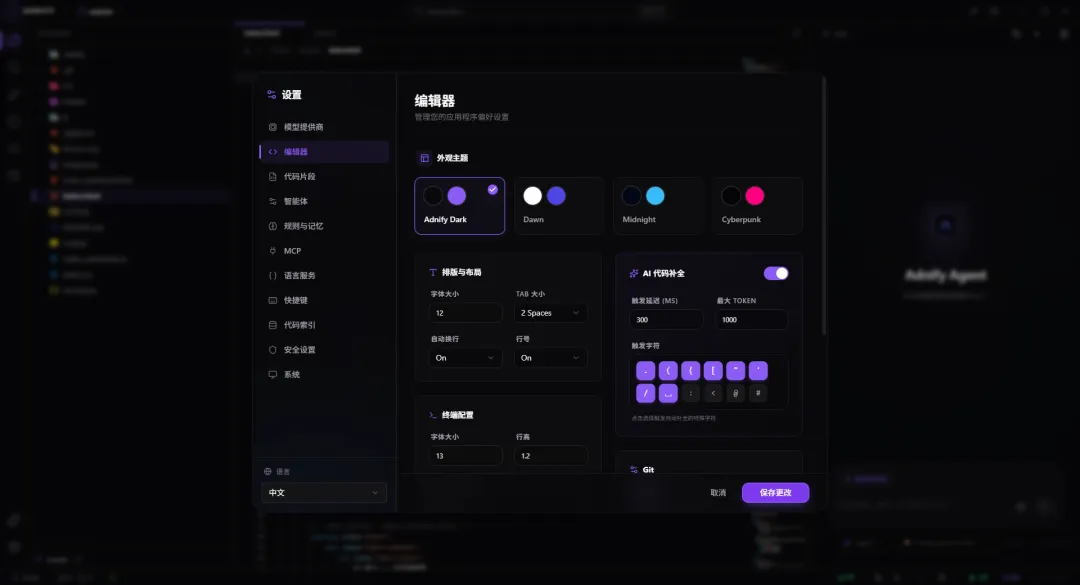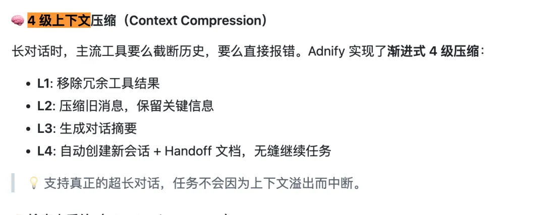 2. 多线程的“快感” (Parallel Tool Executor)大多数 AI 工具在修改多个文件时,是改完 A 文件,再改 B 文件。 Adnify 实现了依赖感知的并行执行。 如果 AI 判定两个文件的修改互不冲突,它会同时动手。这意味着在处理大型重构任务时,它的速度能比竞品快 2-5 倍。3. 给 AI 装了“外脑” (Context Compression)长对话是 AI 编程的死穴。 Adnify 引入了 4 级上下文压缩机制。当对话太长时,它会自动移除冗余信息、生成摘要,甚至自动把当前的记忆打包成文档(Handoff),无缝开启新会话。 你可以和它聊上一整天,它依然记得你早上说了什么。这一点真的很重要。 Adnify 默认支持玻璃拟态(Glassmorphism)设计,配合流光边框和动态阴影,颜值直接把那种工业风的 IDE 按在地上摩擦。写代码的时候,感觉自己就是在黑客电影里。- 检查点系统(Checkpoint): 类似 Git,但比 Git 更细。AI 每次动手前都会自动存档,改错了?一键回滚,不用去翻 Git Log。