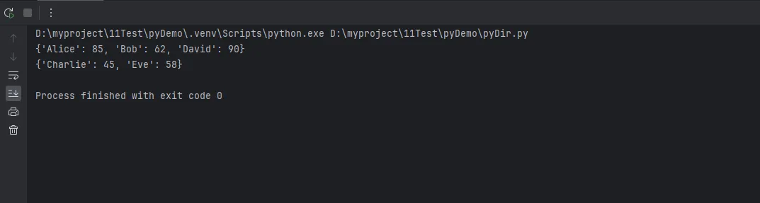 # 学生成绩scores = {'Alice': 85,'Bob': 62,'Charlie': 45,'David': 90,'Eve': 58}# 只统计及格学生passed = {name: score for name, score in scores.items() if score >= 60}# 统计不及格(可以反向筛选)failed = {name: score for name, score in scores.items() if score < 60}
