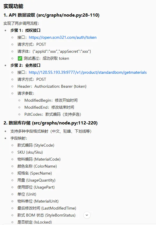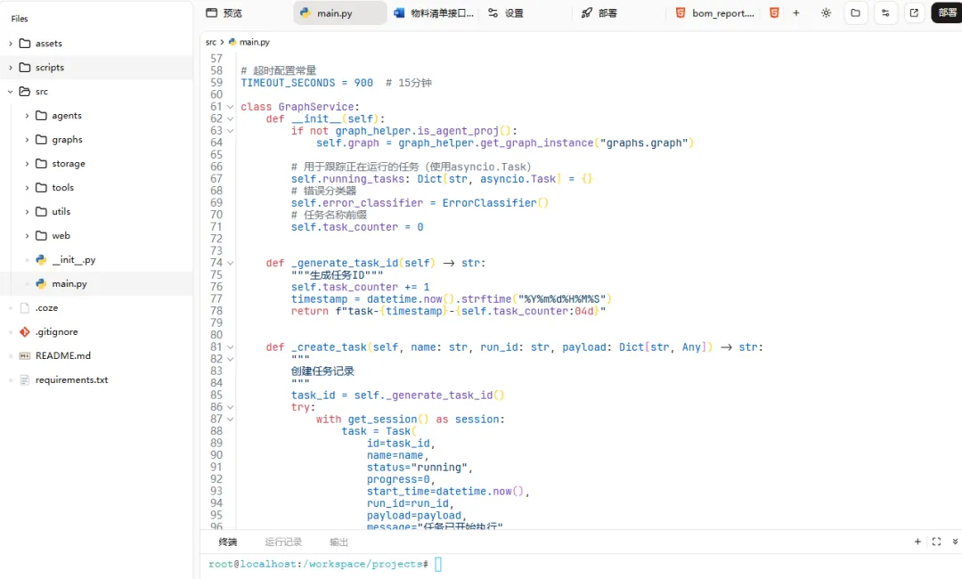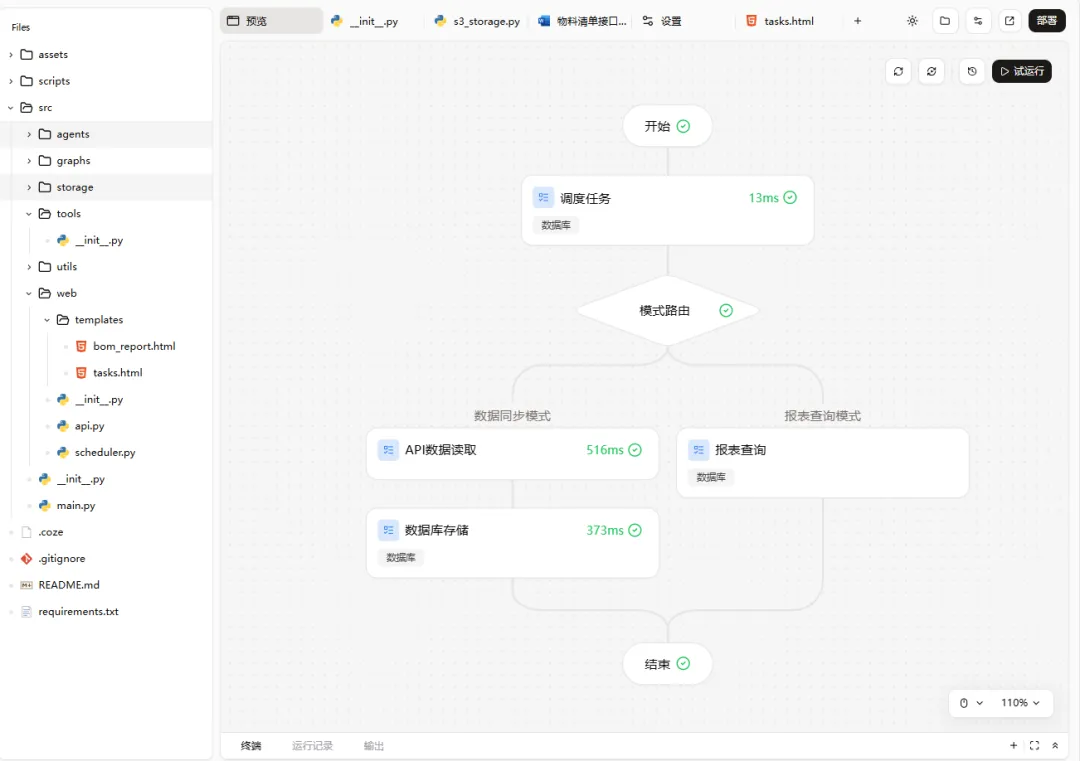 让我惊讶的是,扣子很快就生成了一个完整的工作流代码。虽然代码还有一些小问题,但整体结构已经非常清晰了。我只需要稍微调整一下参数和配置,就可以运行起来。