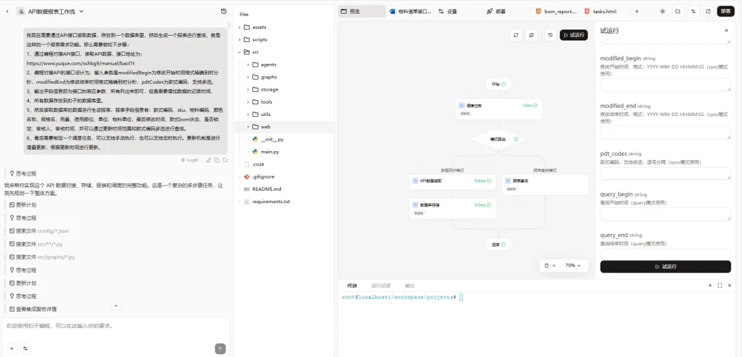 我听说扣子编程可以通过自然语言生成代码,于是决定尝试一下。我给扣子发了一个简单的需求:"帮我搭建一个API数据报表工作流,从API获取数据,生成报表,并实现定时调度"。