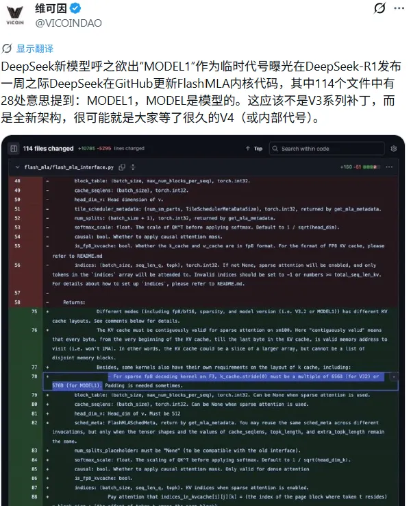 此次曝光源于DeepSeek对其开源推理加速库FlashMLA的更新。在横跨114个文件的代码变动中,出现了28处“MODEL1”标识符,其技术路径与现有的V32(即DeepSeek-V3.2)架构存在显著差异,暗示这是一个经过彻底重构的新设计。