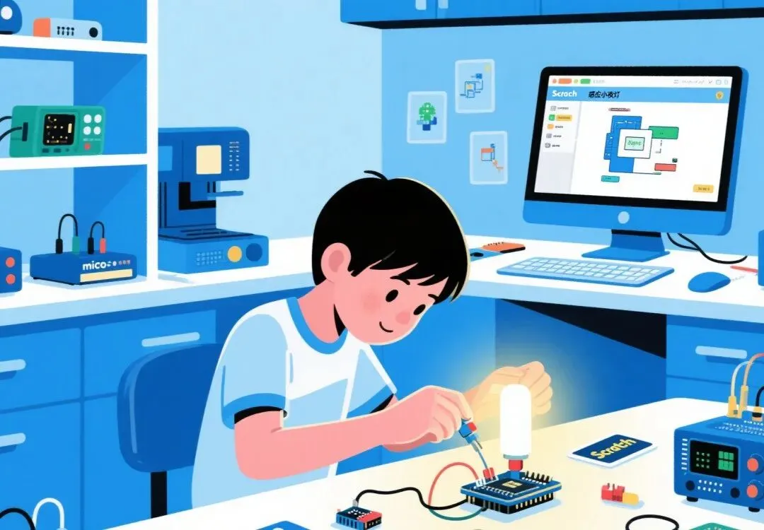 此阶段核心是通过低门槛的动手操作建立孩子对科技的亲近感。Scratch 图形化编程与硬件的结合是最佳切入点,如用 micro:bit 制作 “光线感应小夜灯”,当环境光线变暗时,设备会自动亮起,这种将代码逻辑转化为实际功能的过程,能让孩子直观理解编程的 “条件判断” 概念。在材料选择上,完全可以利用生活中的常见物品,像用纸板和积木搭建 “垃圾分类机器人”,通过舵机控制分类闸门,既锻炼了空间建构能力,又渗透了环保理念。五莲县育才小学在这方面堪称典范,该校 1 至 3 年级每周开设 1 节科技课,进行手工制作和机器人搭建基础班教学。学生们在课程中,用简单材料制作出各类创意小物件,从简易的天平到能活动的机械手臂,在实践中激发了创新思维 。深圳某小学曾有学生用乐高积木和传感器制作出 “智能书架”,当书本被拿取时会自动播报书名,这类创意项目正是低年级孩子科技启蒙的理想载体。