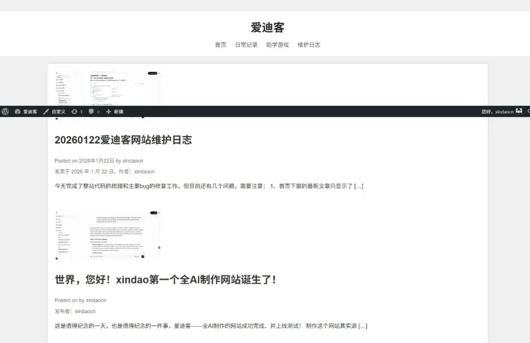 回想起来,第一个模板刚写出来就各种报错,到最后都没有形成一个完整的模板,因而无从展示;主要是我对wordpress模板规则不了解,但幸好AI知道,代码写出来发现配色奇丑无比且报错不断,直接废弃了。然后有了第二个,本意是写个高级灰配色的网页,结果生生整成了一个纯白Blog(如上图所示),效果不甚理想;再然后是第三版……毕竟网站备案还需要不少时间,不行就继续折腾呗!好在,最后写出来了,不仅电脑版代码写完还匹配了手机版本,所以网友有兴趣的话可以手机访问网址(idhe.cn)。