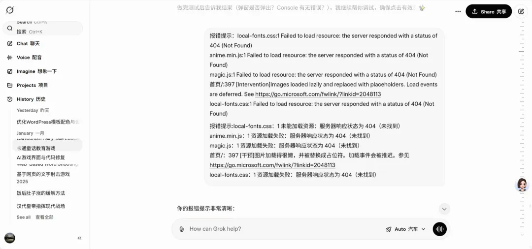 上面两张图是日常deepseek和grok调试程序的截图,为啥不能逮“一只羊”整完?主要是错误太多,实心眼的只薅一只羊实在是撑不住,所以AI工具,我一开始用的是Grok,之后豆包、deepseek、腾讯元宝等AI工具都折腾上了,之所以用Grok开篇,主要是基于GROK是谷歌开发的,它喂养的代码数据量是最多的,然后代码调试阶段全用国产的,哪个方便用哪个,毕竟国产AI对国人审美和习惯更加了解。