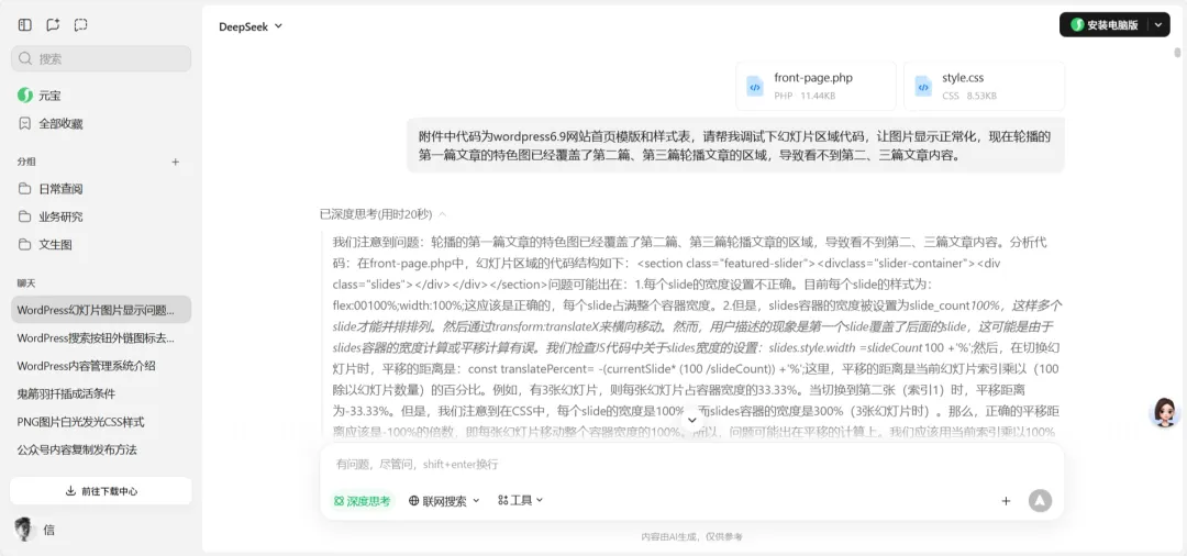 上图是AI帮我分析网页程序BUG并给出解决方法的过程截图