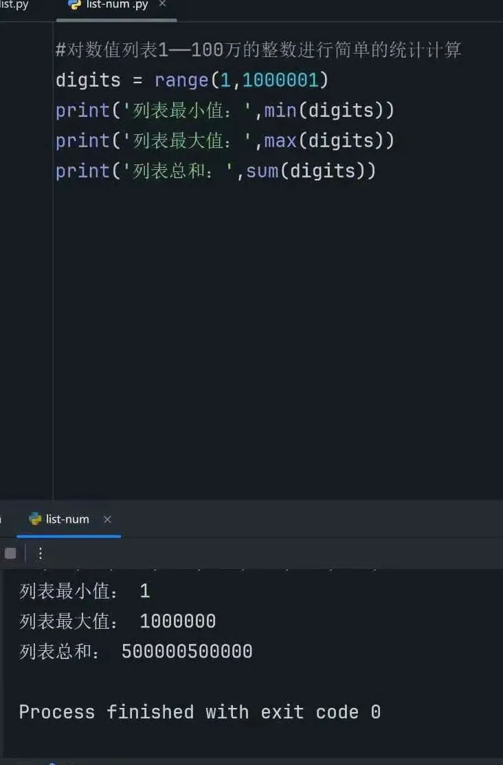 2.对数值列表使用min()、max()、sum()求最小值、最大值、总和。